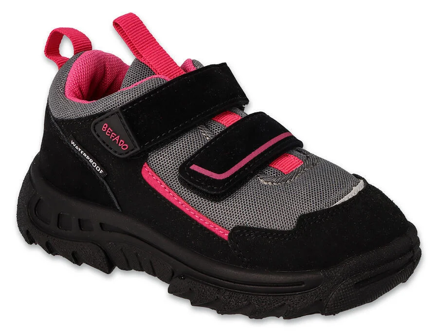 Szívesen töltene időt gyermekével a hegyi túraútvonalon? Vagy esetleg vízálló lábbelire van szüksége gyermekének, aki sok időt tölt a szabadban? A Befado legújabb túracipő modelljét az aktív gyerekeknek ajánljuk, akik nem félnek még esős napokon sem tombolni! A cipők vízállóak, könnyűek, kellően tapadnak a talajon és stabilak. A talp tökéletesen szigeteli a lábat a talajtól, így a cipő tökéletes a hidegebb napokon. A megerősített sarokrész stabilizálja a lábat, a cipő szellős anyaga pedig szabad levegőhöz jutást biztosít. A Befado TREK WATERPROOF trekking cipőre a következők jellemzők: - vízhatlan, ami a cipőt vízállóvá teszi felhőszakadás és őszi eső esetén; - kiváló minőségű anyag, ami szintetikus műbőr, légáteresztő hálóval kombinálva; - praktikus rögzítés rugalmas pánttal és tépőzárral a könnyű felhúzás érdekében; - széles és magas orrnyereg; - rugalmas, csúszásmentes, könnyű PU talp, ami biztonságot garantál számos tevékenység során, tökéletesen szigetel a hideg talaj ellen. Ideális a mindennapi sétákhoz és a hegyi tevékenységekhez egyaránt. Az aktív gyermekeket szem előtt tartva készültek.