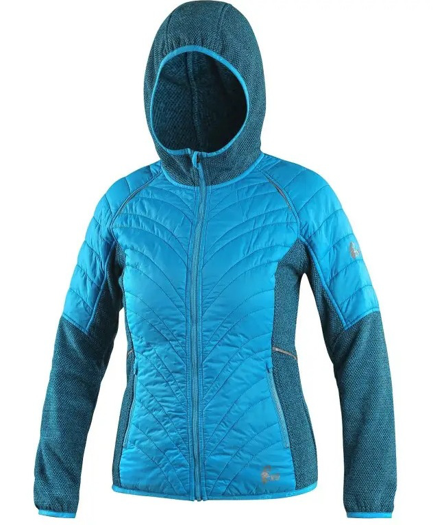 • Anyagkombináció - steppelt részek könnyű szigeteléssel és rugalmas kötött anyag az ujjakon, az oldalakon és a kapucnin.