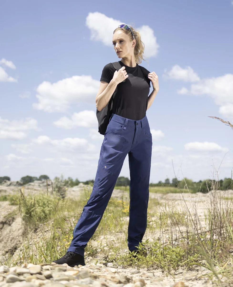 Női szabadidős nadrág, derékig érő, övhurokkal, elülső és hátsó zsebekkel, diszkrét oldalzsebekkel.