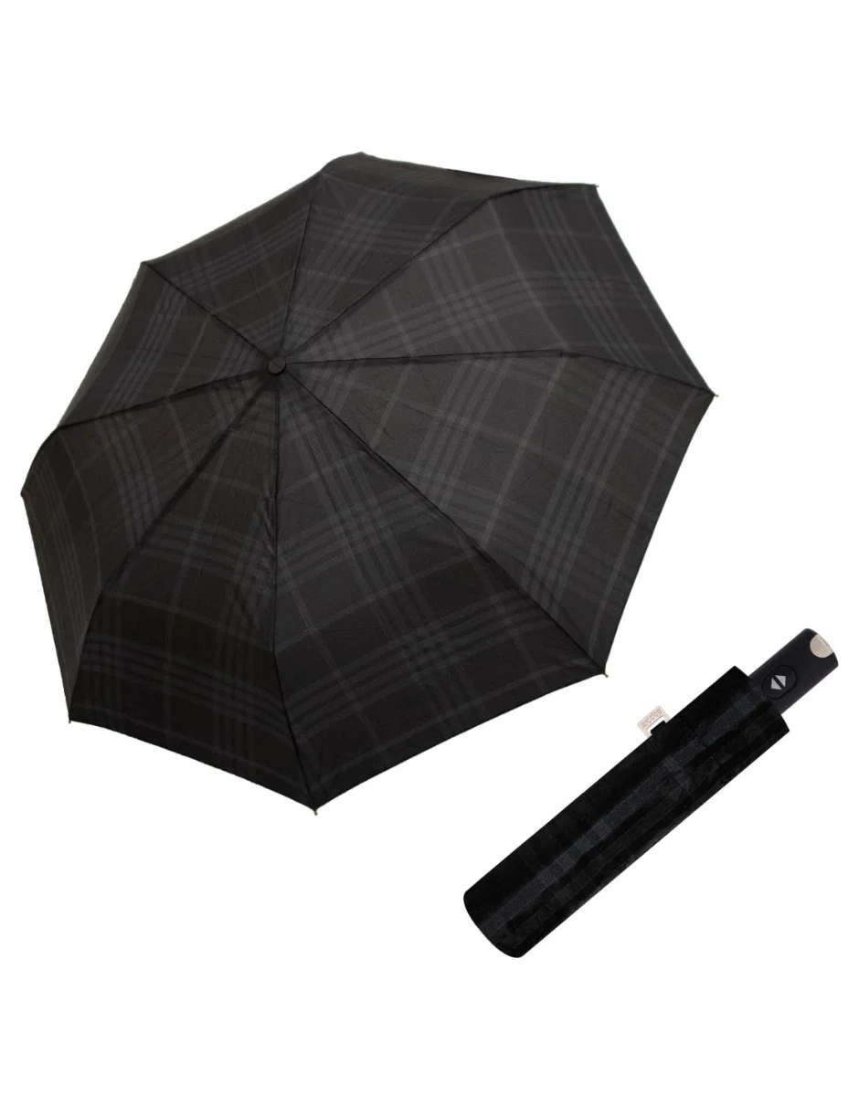 Pánský plně automatický skládací deštník Doppler Carbonsteel Magic woven check black grey s elegantním károvaným vzorem je odolný vůči větru – při převrácení nedojde k jeho poškození. Byl testován ve větrném tunelu BMW při rychlosti větru až 150 km/h. Konstrukce z karbonu je extrémně flexibilní a zatížitelná. Na deštník se vztahuje prodloužená záruka 5 let.