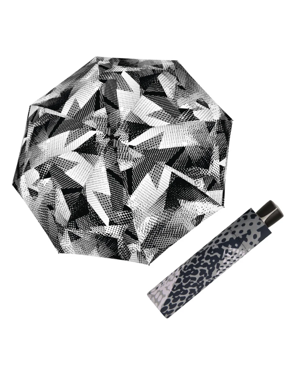 Női összecsukható esernyő színes dizájnnal és praktikus mérettel. Üvegszál, acél és alumínium kombinációjából készült, így egyszerre erős és rugalmas. Elegáns fekete és ezüst színű fogantyúja van a Doppler logóval, poliészter borítása pedig nem zsugorodik, és ellenáll a hőmérséklet- és páratartalom-változásoknak. Előnye továbbá a viszonylag nagy tető (95 cm átmérőjű), amely megbízhatóan megvéd az esőtől. Egy bevált termék, minimális reklamációval.