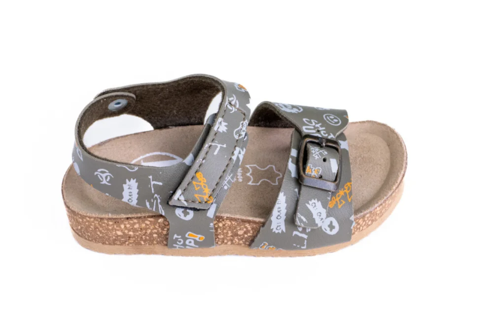 Gyermek bőrpapucs puhított talppal. A papucs felső pántján tépőzár van, a saroknál pedig egy pánt, amely a lábfej megfelelő dőlésszögben tartására szolgál. A cipő Olaszországban készült.