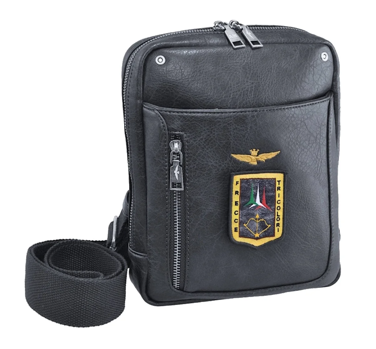 Stílusos könnyű kereszt táska L a váll fölött vagy keresztben a személyes holmik a tekintélyes márka Aeronautica Militare Pilot sorozat antracit színben. Imádni fogja a táska kényelmes méreteit, és minden lényeges dolog, például pénztárca, mobiltelefon, dokumentumok és kulcsok elférnek benne.