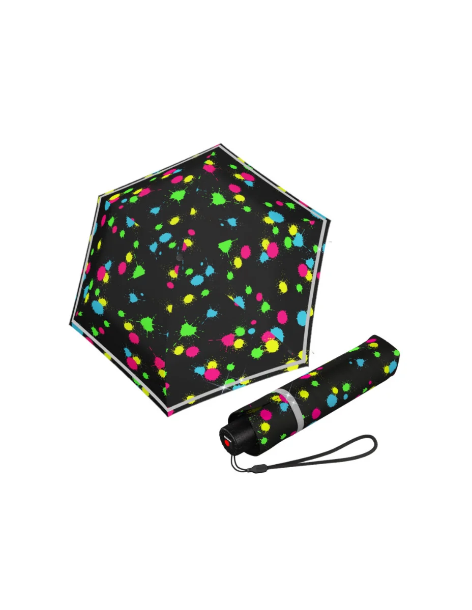 Knirps Rookie Bubble Pust Reflective Robusztus esernyő kompakt csomagolási mérettel és fényvisszaverő csíkokkal. Könnyen használható, könnyű, mindössze 205 g súlyú.Exkluzív fogantyú kialakítás rugalmas csuklópánttal. Időbe telik, amíg a gondolatokból ötletek és végül termékek lesznek. Ez történt a Knirps Rookie esernyővel is a ROOKIE diákernyő kifejlesztésével,amelyet évek óta terveztek a termékcsalád betetőzéseként. Amikor egy iskolásoknak és fiataloknak szánt esernyő tervezéséről van szó, a Knirps eltekint a tipikus gyermekmotívumoktól, nincsenek egyszarvúak, hercegnők vagy sárkányok az esernyő tetején. A hat merész és élénk uniszín mellett van egy szemtelenül szemet gyönyörködtető dizájnBubble Bust neonszínű fröccsenésekkel fekete alapon.választhatsz a geometrikus és színes Triple Blue és Triple Pink dizájnok közül is.A dizájn és a biztonság természetesen nem zárhatja ki egymást, ezért a biztonság a tervezési lehetőségeknél elsődleges fontosságú, a fényvisszaverő szalag is szerepel ezeken az esernyőkön. A praktikus csomagméretnek köszönhetően a ROOKIE mindig elfér egy aktatáskában, táskában vagy hátizsákban. Mostantól egyetlen gyermeket és fiatalt sem lep meg többé az eső. A könnyű kezelhetőség és a tartós anyagok a ROOKIE-t tökéletes mindennapi társsá teszik, a szülők pedig biztosak lehetnek benne, hogy a fényvisszaverő elemeknek köszönhetően a kicsik biztonságban és láthatóak az úton. Természetesen az esernyőt szélcsatornában is tesztelték, hogy akár 80 km/h-s szélsebességnek is ellenálljon károsodás nélkül. A Knirps a teljes termékcsaládra öt év garanciát vállal, ami ismét kiemeli a Németországban tervezett és fejlesztett esernyők minőségét.