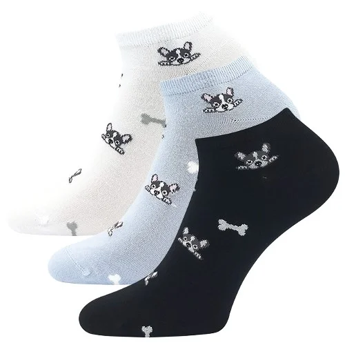 A Lonka® BIBIANA női bambusz zokni női alacsony zokni a mindennapi használatra. Imádni fogod a kutyákat vagy macskákat ábrázoló aranyos motívumokat. A bambusz viszkóz természetes antibakteriális és antiallergiás tulajdonságokkal rendelkező természetes anyag, a puha és sima szál kellemes tapintású és bőrbarát, jól felszívja a nedvességet. A minőségi zokni a 200 tűs kötésnek köszönhetően puha és sima felületű. A lábujjakat láncos fűzéssel zárják, így nem nyomnak sehol. A praktikus 3 pár zoknit tartalmazó csomagban vegyes színösszeállítású zokni található.