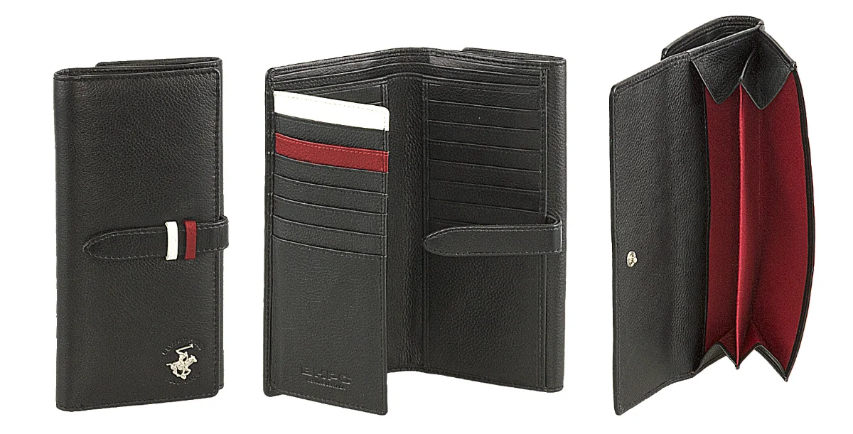 Dámská kožená peněženka značky Beverly Hills Polo Club série Loop v oblíbené černé barvě. Stylová dámská peněženka Beverly Hills Polo Club BH-1350 je přesně ten typ doplňku, který vypadá nenápadně luxusně a zároveň dává smysl v každodenním provozu. Kvalitní černá kůže, kontrastní červeno-bílé detaily a ikonické logo značky dávají jasně najevo, že tohle není žádná laciná náhražka. Uvnitř najdete přehledné členění s dostatkem prostoru pro platební i věrnostní karty, doklady a bankovky. Samostatná přihrádka na mince se zapínáním udrží drobné tam, kde mají být – žádné chrastění po kapsách. Praktické zapínání na druk zajišťuje, že peněženka drží tvar a obsah zůstane bezpečně uvnitř.