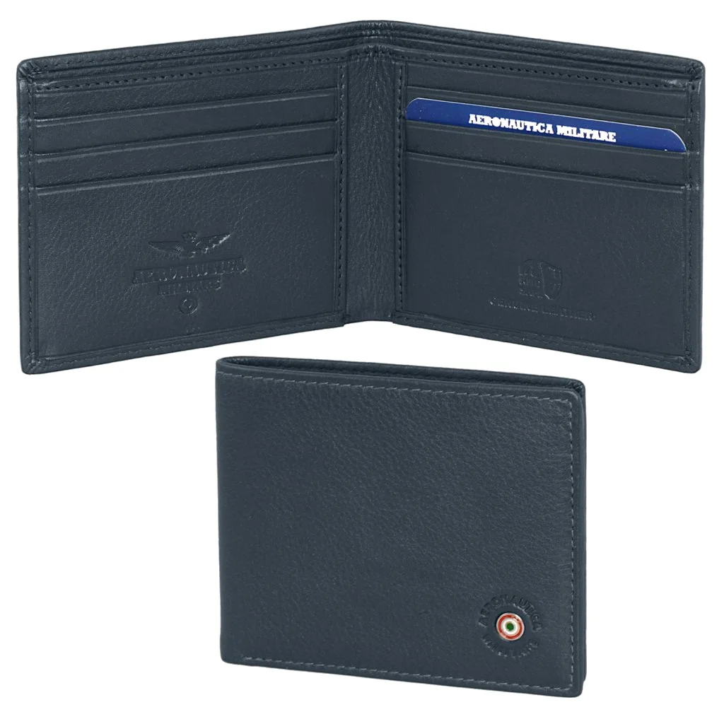 Férfi bőrtárca a tekintélyes olasz Aeronautica Militare Plate sorozatból a népszerű kék színben. Stílusos pénztárca, amely alkalmas sportos férfiaknak, akik az eleganciát is kedvelik.