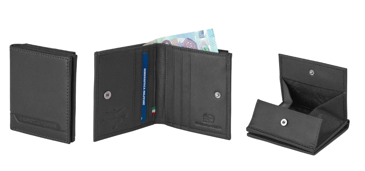 Férfi bőrtárca a tekintélyes olasz Aeronautica Militare Moon sorozatból a népszerű fekete színben. Stílusos pénztárca, amely a sportos férfiak számára is alkalmas, akik szeretik az eleganciát és funkcionális kiegészítőt keresnek.