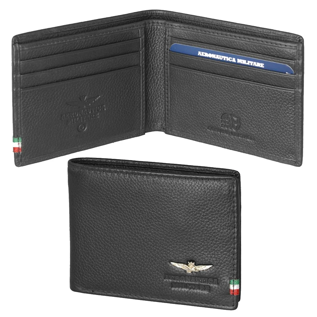 Férfi bőrtárca a tekintélyes olasz Aeronautica Militare márkától fekete színben. Stílusos pénztárca, amely alkalmas sportos férfiaknak, akik az eleganciát is szeretik.