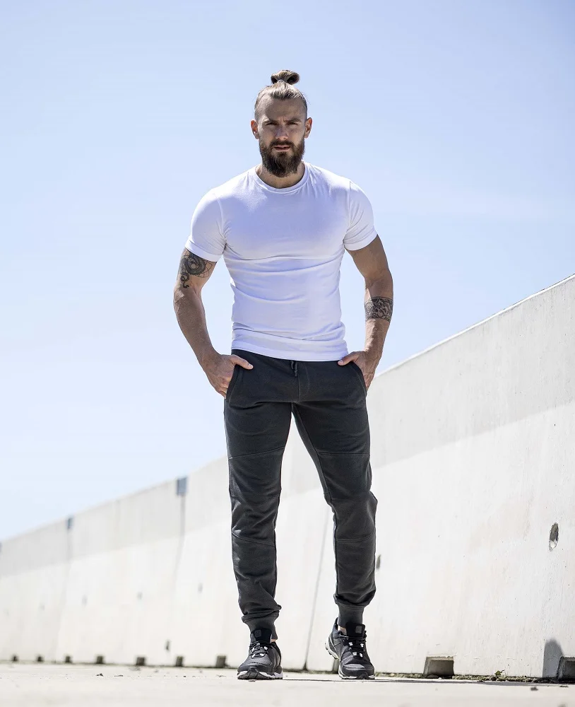 Férfi tréningnadrág, fűzős derékpánt, oldalsó cipzáras zsebekkel.