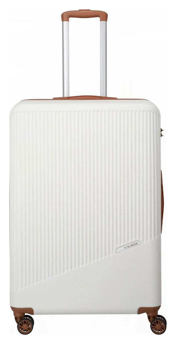 Négykerekű, robusztus ABS műanyagból készült kagylós bőrönd divatos fehér színben, beépített TSA zárral.