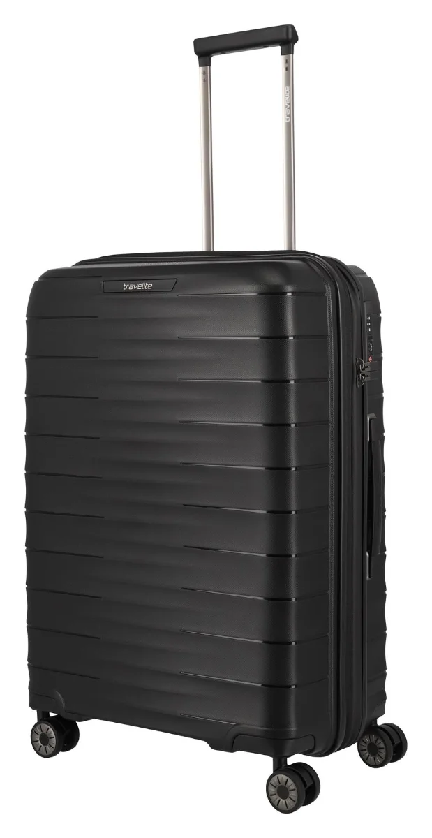 Újrahasznosított polipropilénből készült, négykerekű, közepes méretű utazótáska, beépített TSA zárral, tágítóval és esőálló cipzárral.