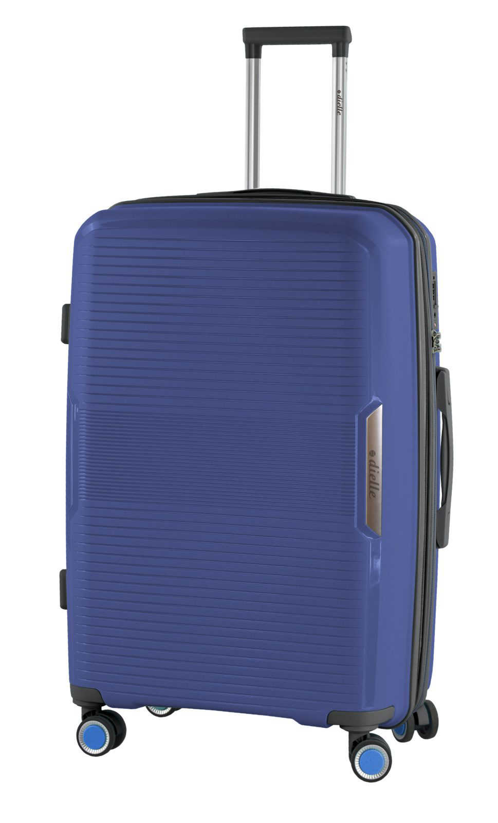 Modern, ultrakönnyű, 76 cm-es műanyag bőrönd az olasz Dielle márkától, kék csíkos színben.