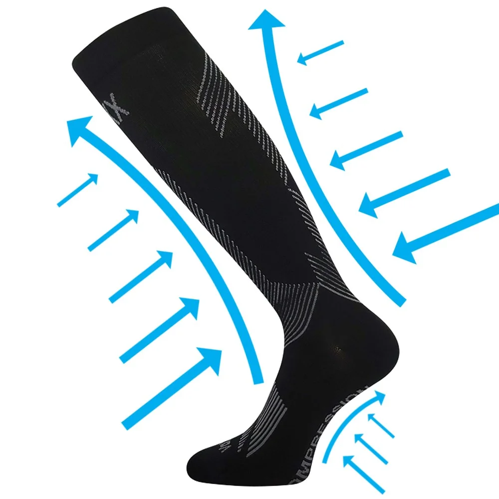 A VoXX® EDICT kompressziós zokni különleges kialakítással rendelkezik az Ön egészsége érdekében. A fokozatos masszázsnyomásnak köszönhetően pozitívan hatnak a vérkeringésre. Különösen alkalmasak ott, ahol az alsó végtagok túl nagy megterhelésnek vannak kitéve. Alkalmasak sporttevékenységekhez, ahol az izmok gyorsabban regenerálódnak, a véráramlás fokozódik, és az izmok így jobban oxigénnel telítődnek. A VoXX® kompressziós zoknik alkalmasak a hosszú ideig tartó álláshoz is, vagy éppen ellenkezőleg, a munkahelyen való hosszú ideig tartó üléshez vagy a különböző közlekedési eszközökön való hosszú ideig tartó utazáshoz. A gyenge sportzoknik a visszérbetegségek megelőzésére is szolgálnak. További előnye a silproX® anyagban található ezüstionokkal történő antibakteriális védelem, a magas bambusz viszkóz aránynak köszönhetően pedig a zokni tökéletesen felszívja a nedvességet, és kellemes a bőr számára.