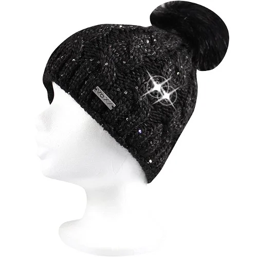 - női kötött sapka merinó gyapjúból és alpaka gyapjúból (dél-amerikai teve szőréből), flitterekkel díszítve, belül mikrogyapjúval.