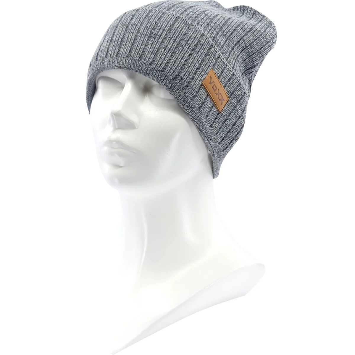 - téli kötött sapka férfiaknak, bordázott elegáns megjelenéssel, luxus VoXX® bőrfoltokkal kiegészítve.